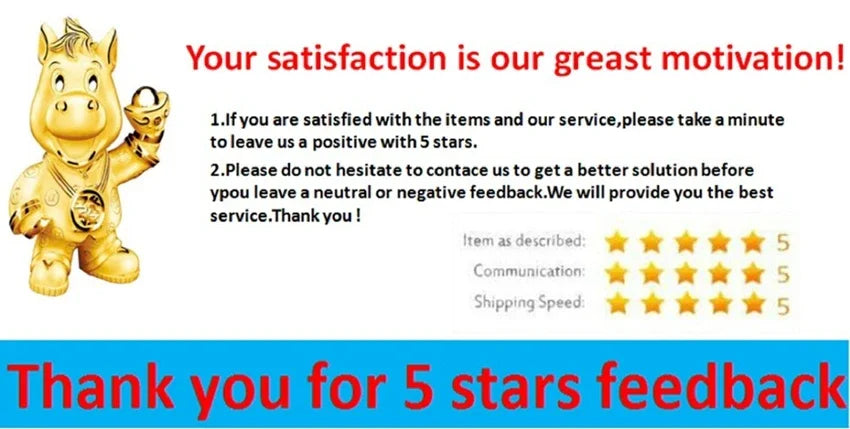 We alaways appreciate and try to care about our valued customers,please give us opportunity to resolve any problem that may upset and frustrate you.please send us E-mail first before you want to leave negative feedback or dispute on Aliexpress,we are sure you will satisfactory with our answer.Your understanding and encourage will keep us moving forward,Thank you!